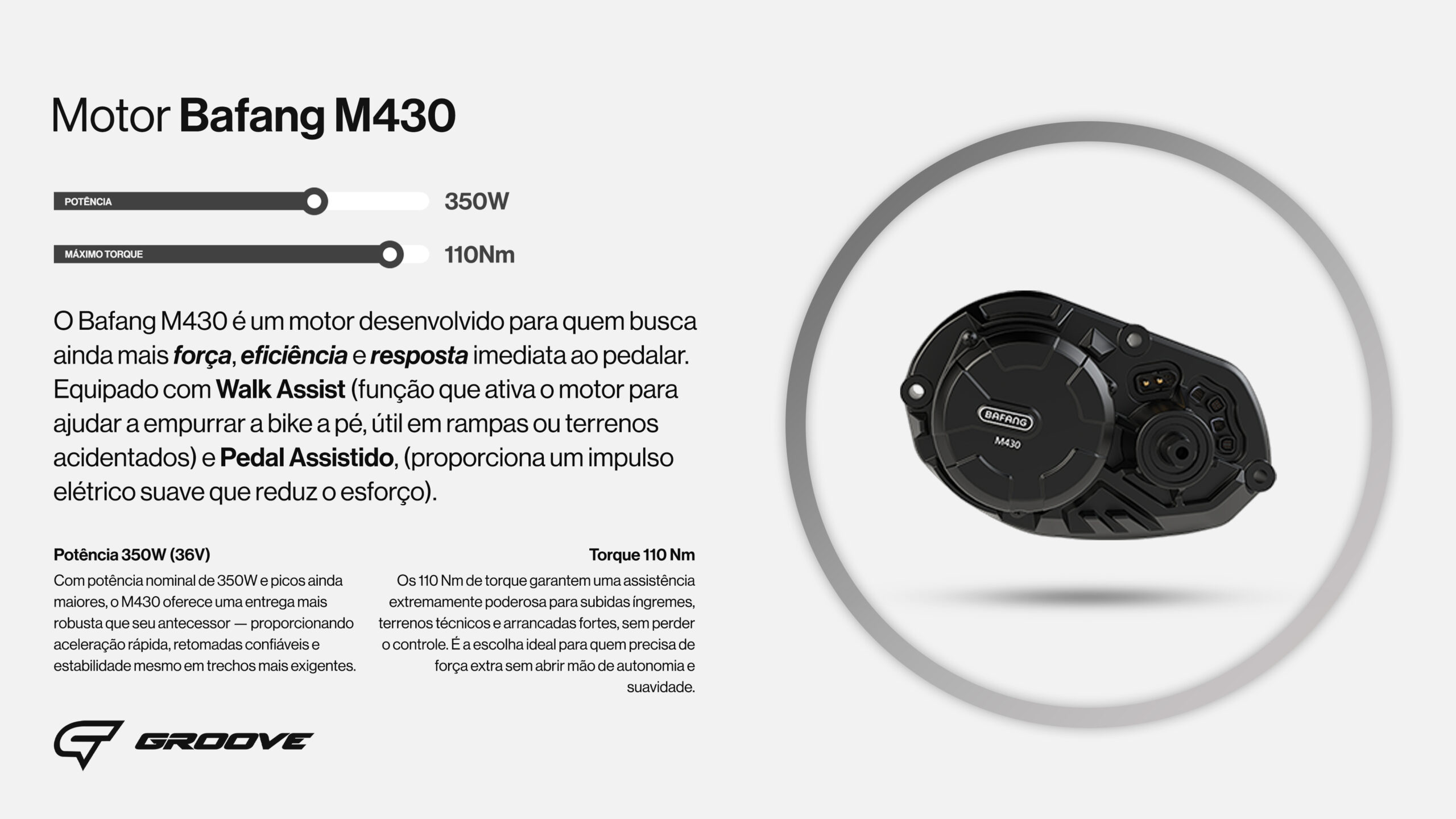 Com potência nominal de 350W e picos ainda maiores, o M430 oferece uma entrega mais robusta que seu antecessor — proporcionando aceleração rápida, retomadas confiáveis e estabilidade mesmo em trechos mais exigentes.