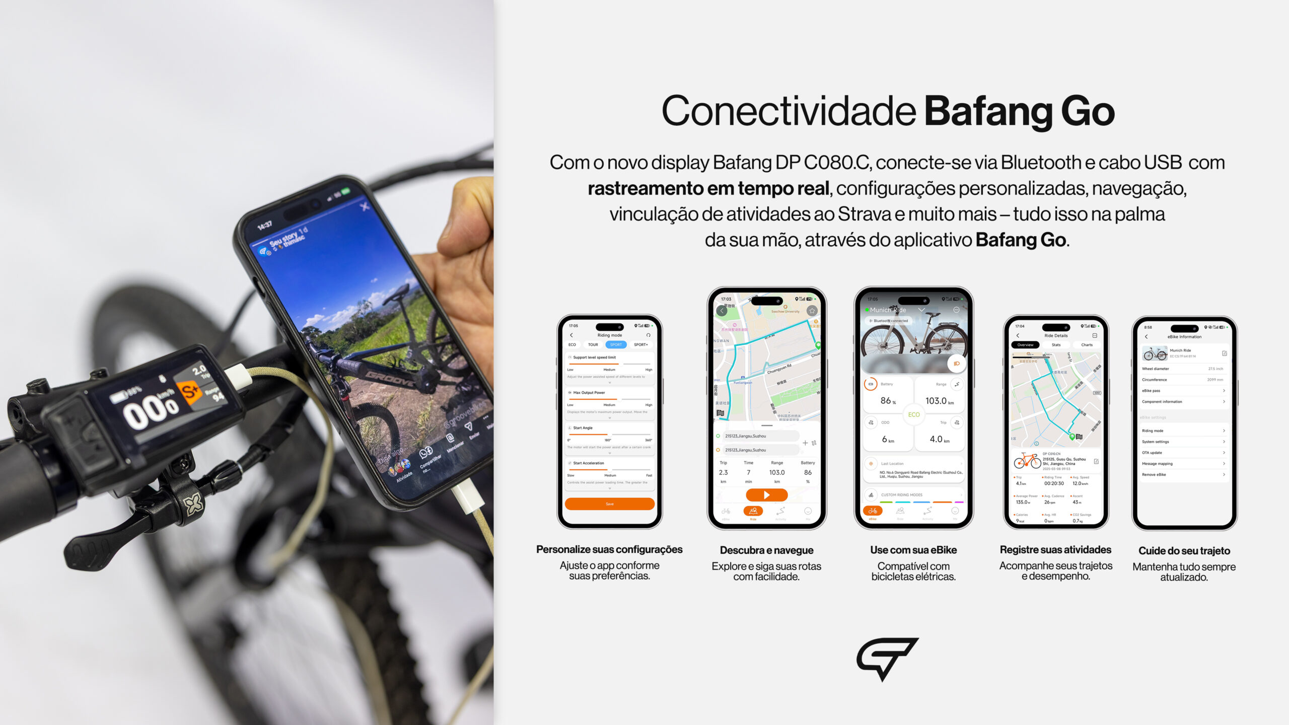 O display Bafang DP C080.CB com Smart Connect permite conexão via Bluetooth com o Bafang Go App, oferecendo navegação, configurações personalizadas e integração com o Strava para análise de dados e rotas.