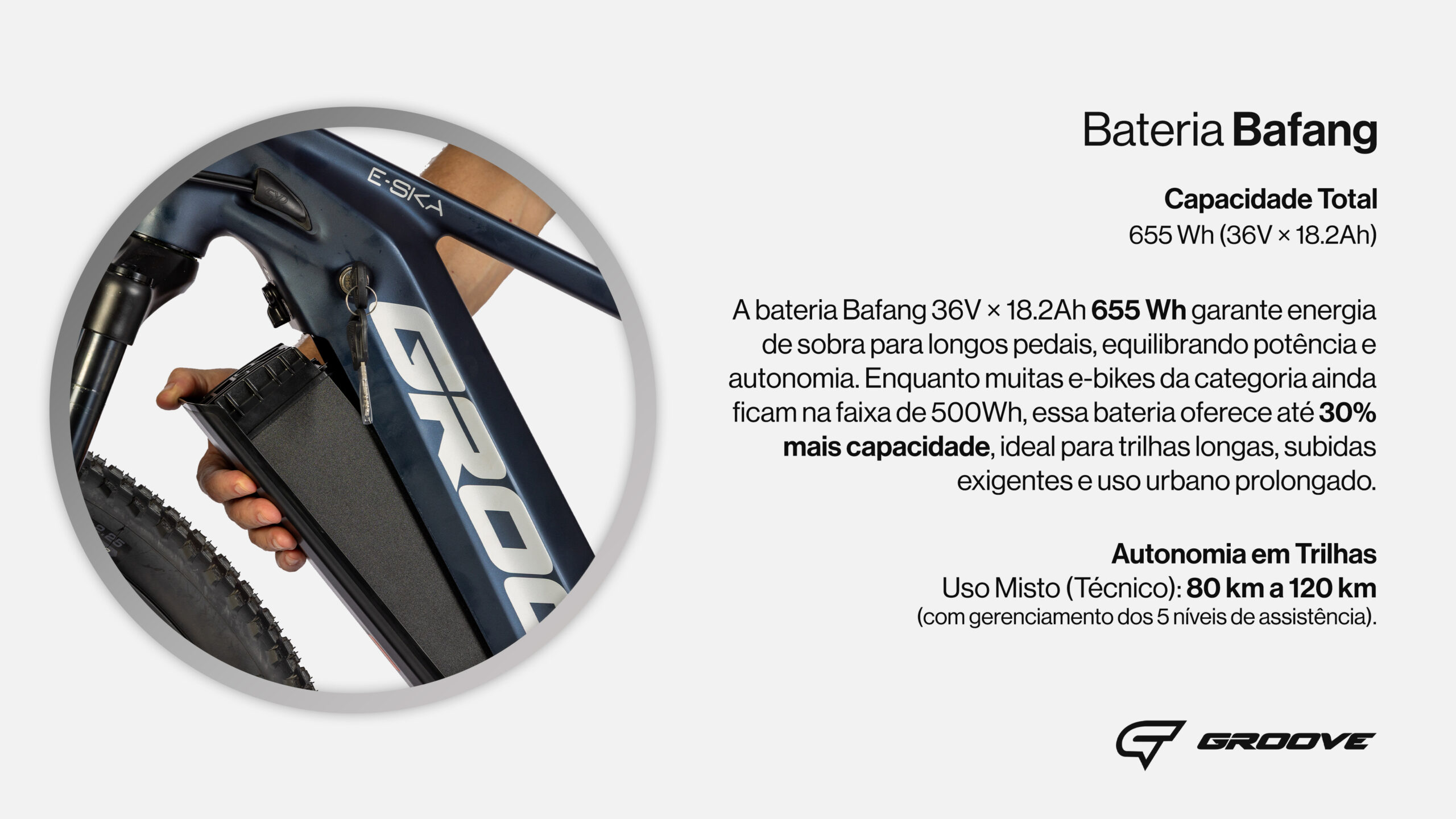 Com 655 Wh, essa bateria garante autonomia consistente e desempenho confiável mesmo em percursos off-road longos ou dias inteiros de aventura.