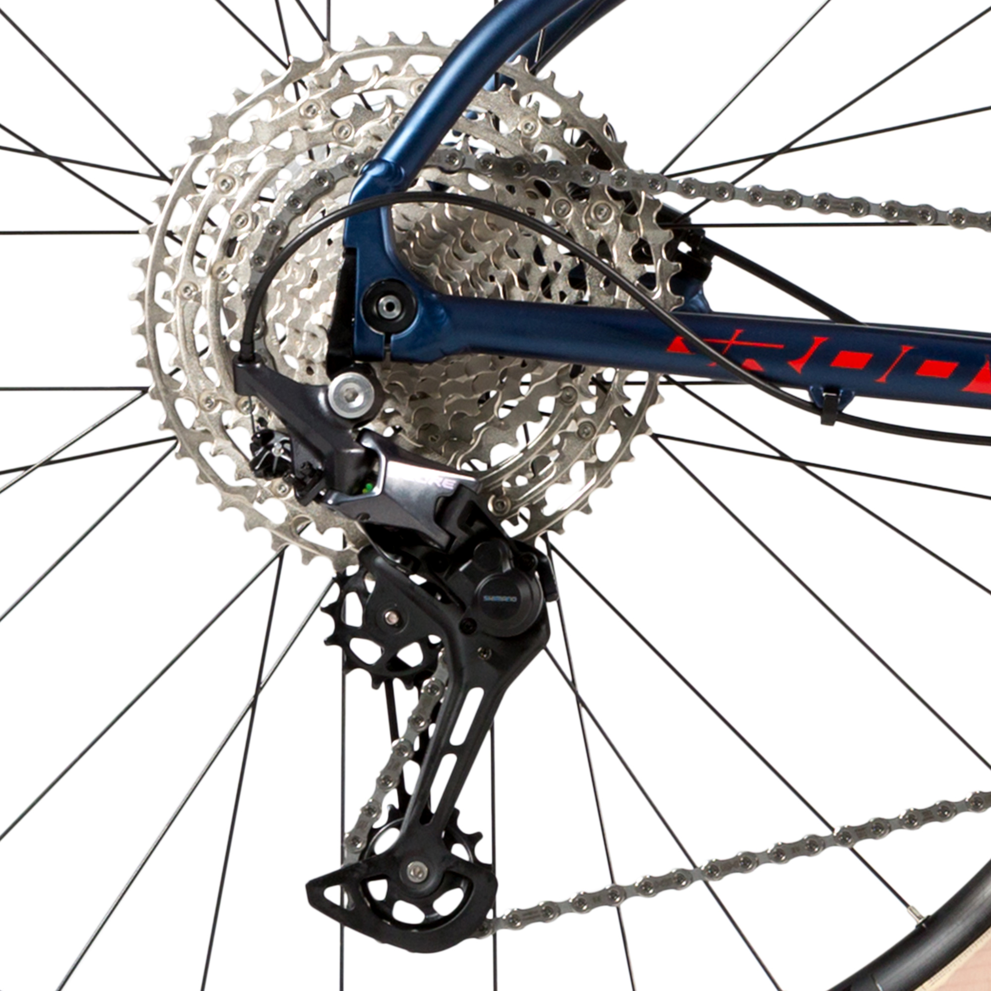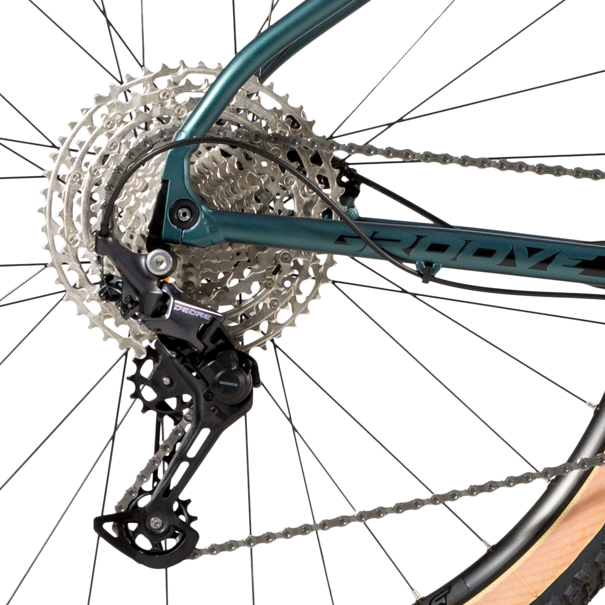 Conjunto de transmissão 100% Shimano, câmbio traseiro Deore de 12 velocidades com a mesma qualidade e resistência de grupos superiores da Shimano. Cassete, corrente e pedivela também Deore. O pedivela Shimano é de acordo com o tamanho do quadro, para melhor adaptação do ciclista sob a bike.